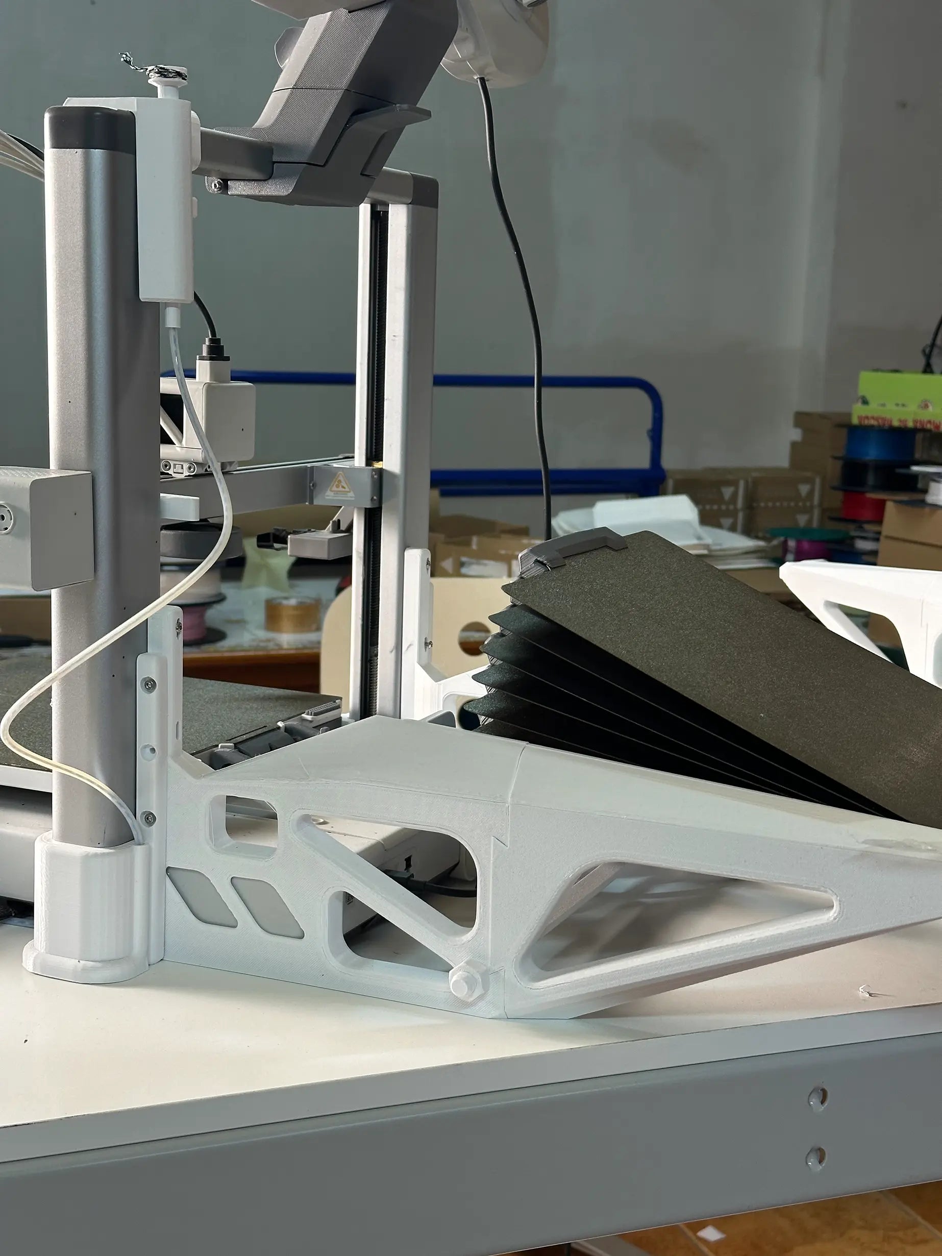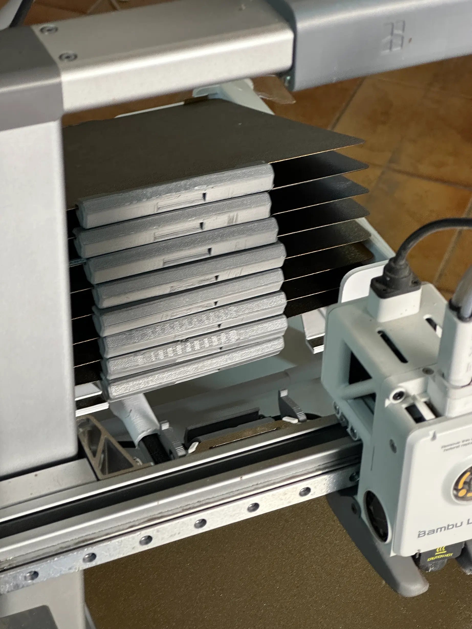 El sistema utiliza una combinación simple pero efectiva de imanes, hilo de pescar y gravedad. Al finalizar una impresión, una nueva placa cae sobre la anterior, expulsándola automáticamente. Así puedes dejar tu impresora trabajando con hasta 10 placas consecutivas sin intervención.
